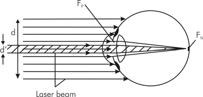 Regarding their hazard potential, lasers are categorized according to safety class 1 through 4. High-power lasers, which are the only ones used for materials processing (> 0.5 W in the CW mode), are invariably class 4 lasers, therefore requiring the strictest safety protection. But even high-power lasers show major differences with regard to the potential hazard primarily because of the wavelength and its effect on the human eye. The human lens and cornea focus collimated (i.e., parallel) laser radiation onto a tiny spot on the retina that is only a few percent of a millimeter in size –thus amplifying the intensity by a factor of approx. 300,000, a phenomenon known as the m “burning-glass effect” that can easily damage the retina.